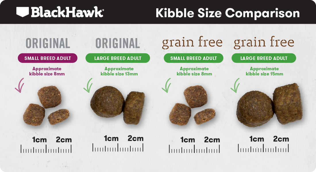 When choosing between small and large breed foods, the key differences in Black Hawk products come down to kibble size, caloric density, and feeding guidance - all scientifically formulated to meet the real needs of small versus large dogs.