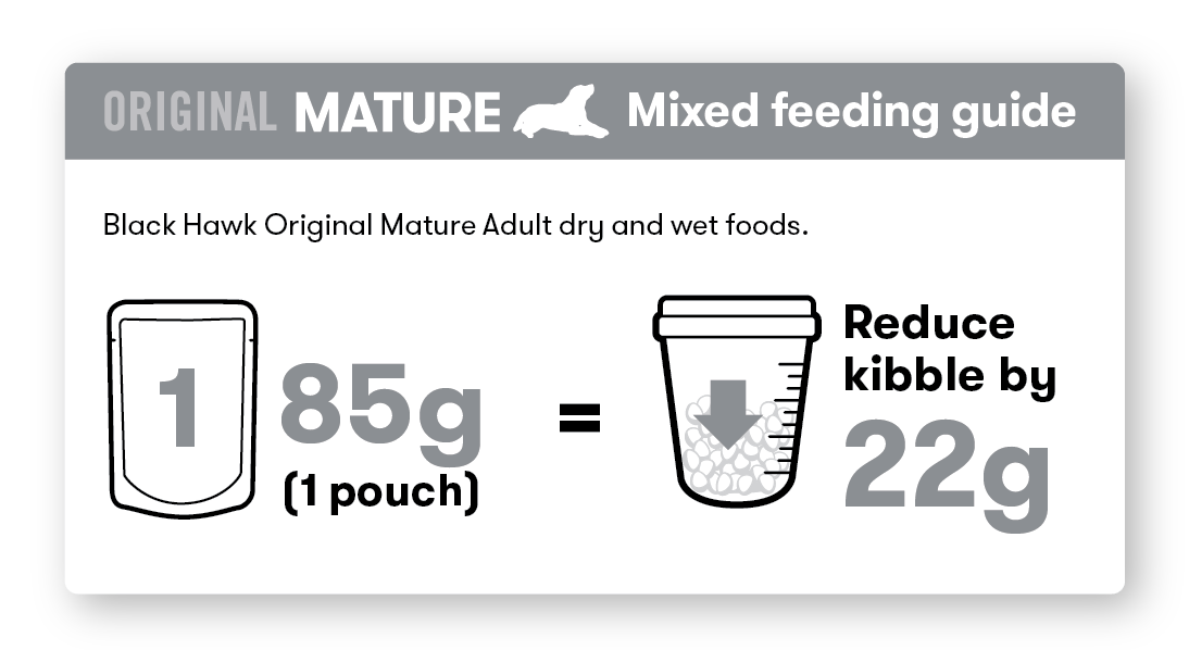 For each pouch per day we recommend reducing the amount of Black Hawk Mature Chicken or Lamb dry food per day by 22g.