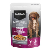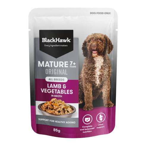 As a pet parent of a mature dog aged 7 and older, it’s natural to want to offer your dog a range of textures and flavours, especially as they mature. Black Hawk’s Original Mature Lamb & Vegetables is specifically formulated to include glucosamine, chondroitin and algae oil to help support healthy joints and mobility in mature dogs. Served in a rich and delicious chicken broth with nutritious vegetables and lamb, a highly digestible protein rich in iron and vitamin B12, which may assist your mature dog’s heart health.